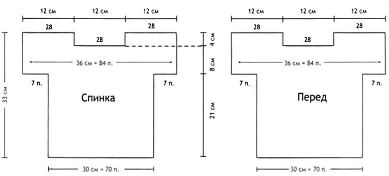 Спинка: ниткою помаранчевого кольору набрати ланцюжок з 70 в. п. і в'язати візерунком за схемою 1. На висоті 21 см від початку в'язання набрати для рукавів з обох боків додатково по 7 п. = 84 п. і в'язати прямо. Через 8 см закрити для вирізу горловини центральні 28 п. і в'язати окремо. На загальній висоті 33 см закінчити в'язання.