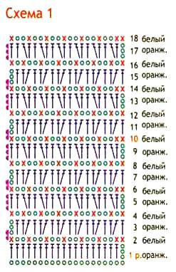 Перед: ниткою помаранчевого кольору набрати ланцюжок з 70 в. п. і в'язати візерунком за схемою 1. На висоті 21 см від початку в'язання набрати для рукавів з обох боків додатково по 7 п. = 84 п. і в'язати прямо. Через 8 см закрити для вирізу горловини центральні 28 п. і в'язати окремо. На загальній висоті 33 см закінчити в'язання.