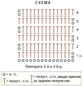 Пряжею секційного фарбування гачком № 2 набрати ланцюжок із 62 в. п. і в'язати візерунком за схемою. На висоті 21 см закрити для пройм з обох сторін у кожному р. 4 п., 2 п. і 1 п. = 48 п. На загальній висоті 36 см закінчити в'язання.